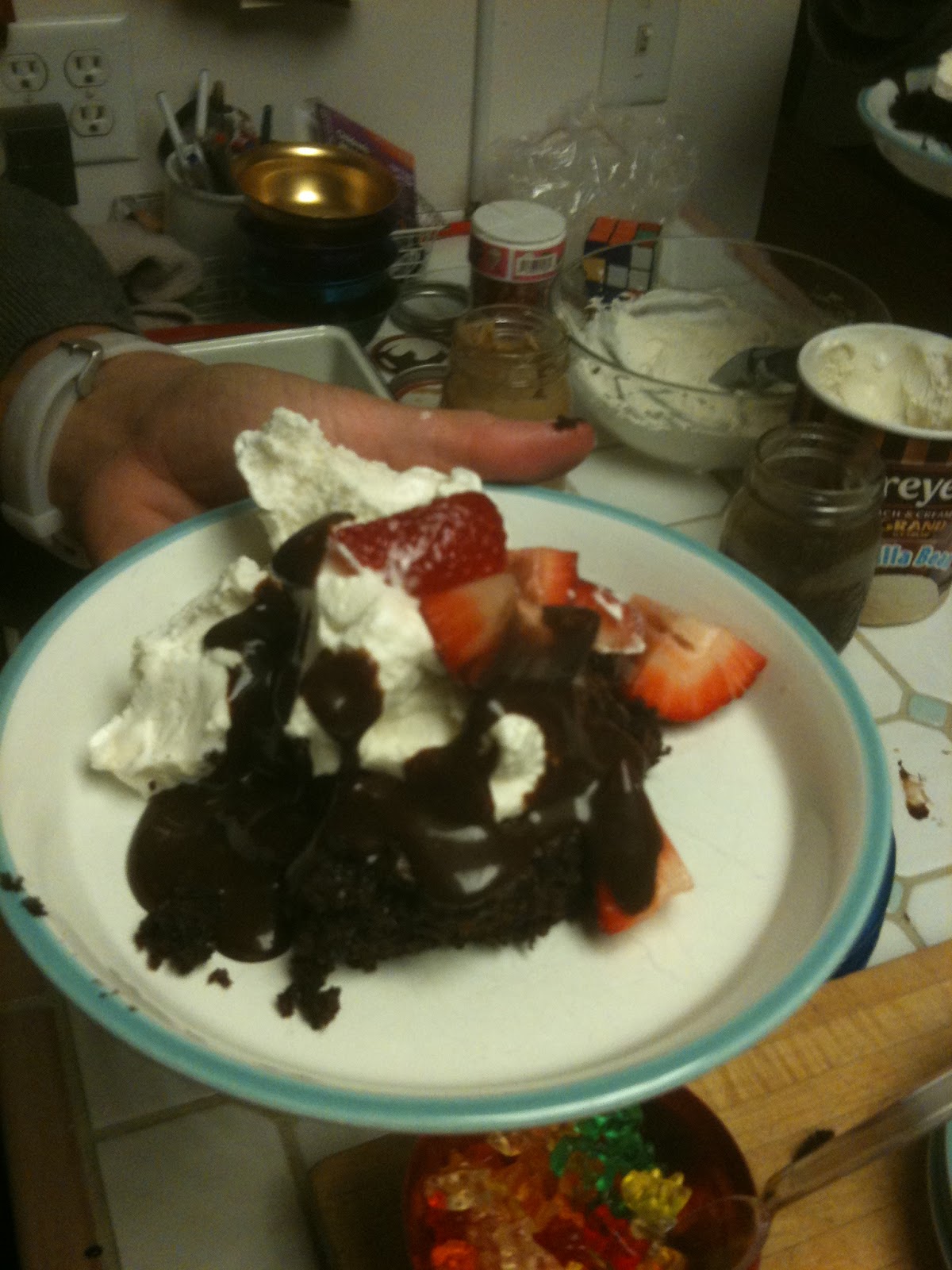My husband: Just strawberries. I'm really very full. And maybe a tiny bit of that whipped cream. Oh, OK, pass the hot fudge, too.